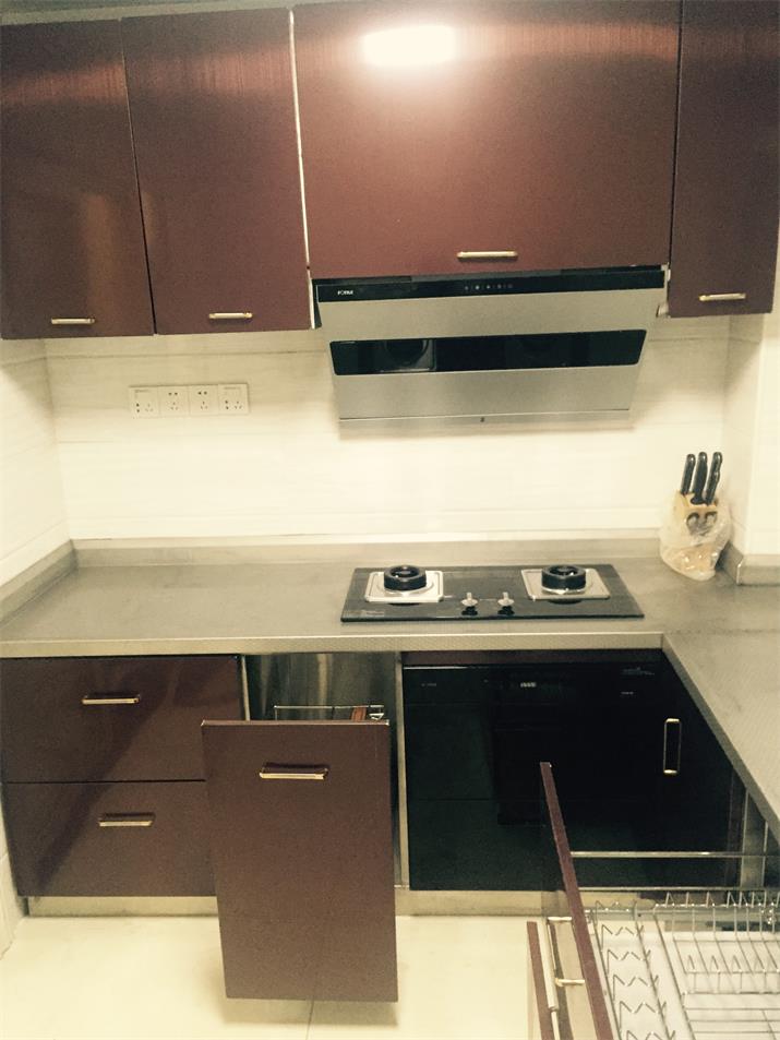此套酒紅不銹鋼整體櫥柜,臺面板采用實厚2毫米304材質。可以使用100年的不銹鋼整體櫥柜。